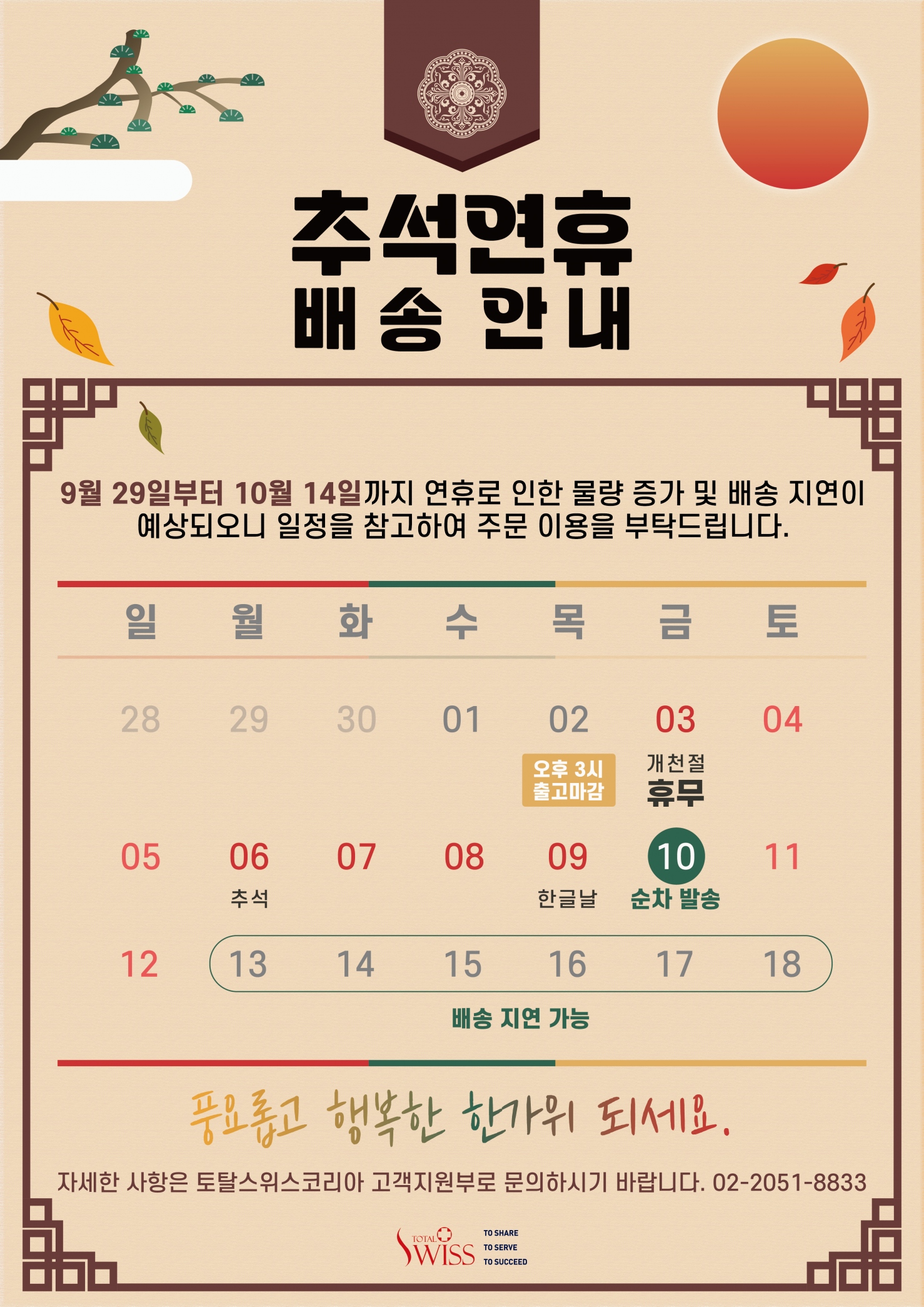 회사명 : 토탈스위스코리아㈜ 주소 : 서울 중구 칠패로42 우리빌딩 13층, 18층 TEL : 02-2051-8833 FAX : 0505-310-8833 대표 : 왕웬친 사업자등록번호 : 598-81-00355 통신판매업신고번호 : 제 2025-서울중구-683호 이메일 : cs@totalswisskorea.com